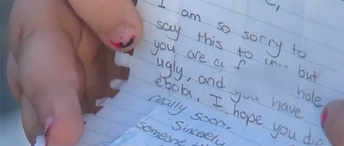 The letter insulted her appearance, called her names, accused her of having “ebola”, and even said they hoped she would die. It was signed, “someone who can afford more than you”.